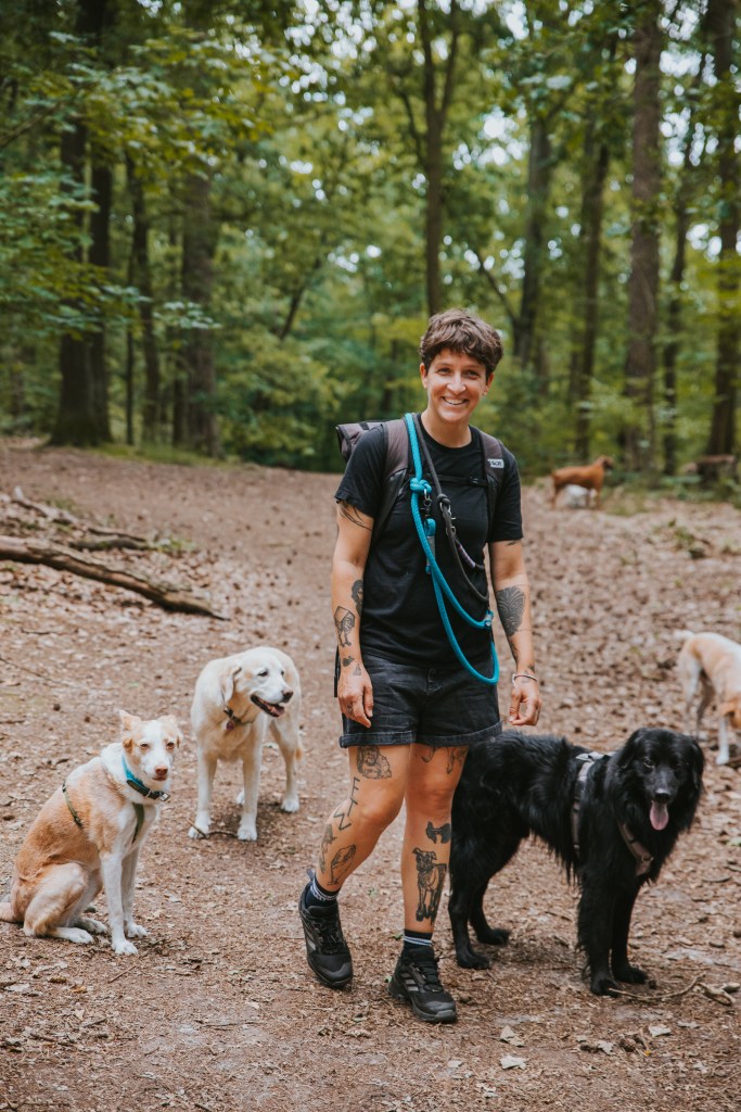 Ich bin mit ihnen durch den Wald gestromert, hab im richtigen Moment den Finger weggezogen, aber auch meine Pizza geteilt. Und mich haben Hunde gedanklich, auch während meiner Ausbildung zur Pädagogin und dem Studium der Erziehungswissenschaften, einfach nicht losgelassen – ich find sie als Sozialpartner einfach spannend. Meine fachliche Auseinandersetzung begann schließlich mit dem Dogwalking.